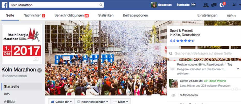 Logge Dich bei Facebook ein, suche unser Profil „Köln Marathon“ bzw. „www.facebook.com/koelnmarathon“ und klicke auf „Gefällt mir“. Schon kommen unsere Infos direkt in Deinen Feed und Du bist immer up-to-date!